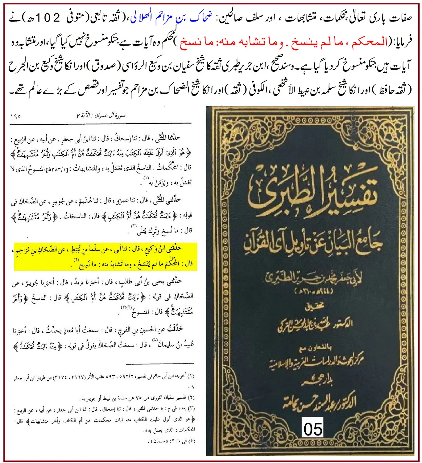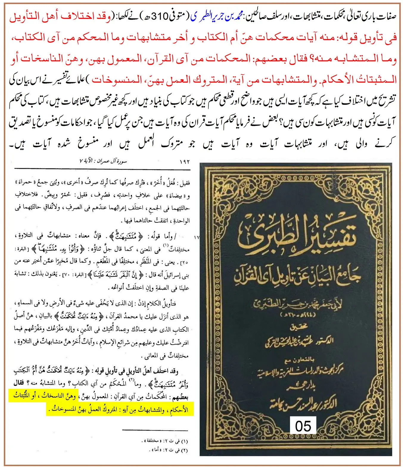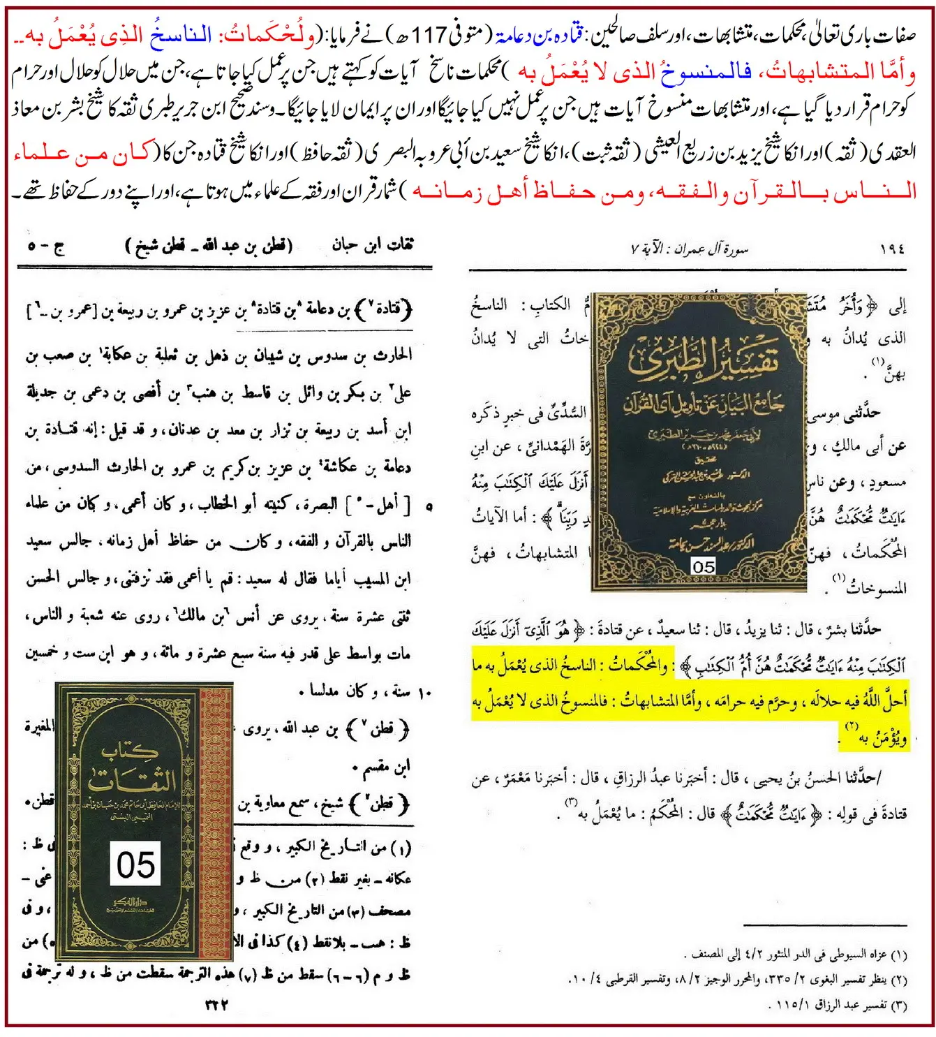 The muḥkamāt are those abrogating verses upon which action is based. The mutashābihāt are the abrogated ones—no action is based on them, but belief is maintained.