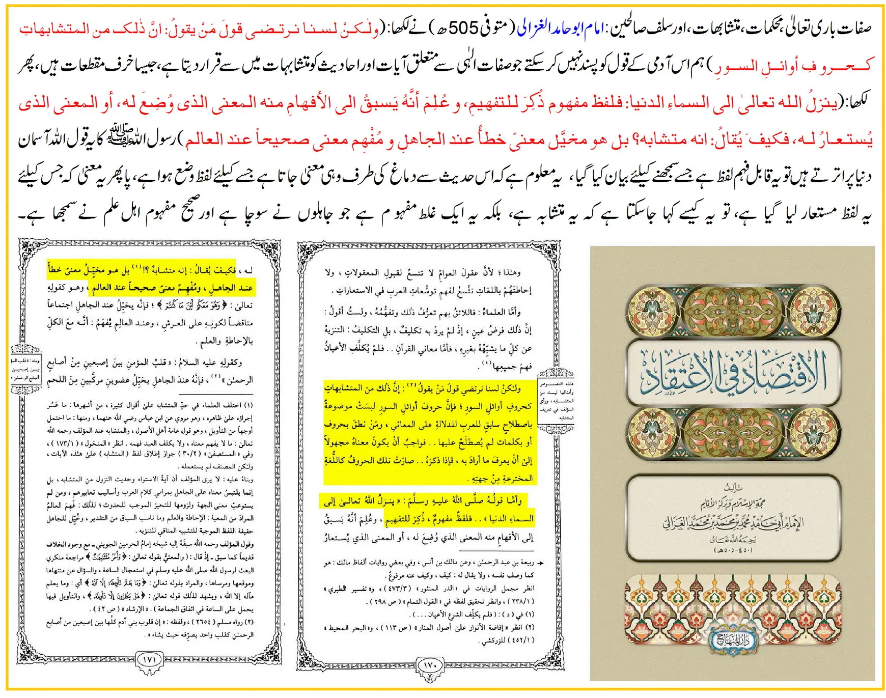 We do not approve of those who label the verses on Divine Attributes as mutashābih like the disjointed letters (ḥurūf muqaṭṭaʿāt). These are understandable words, and scholars derive their meanings correctly.