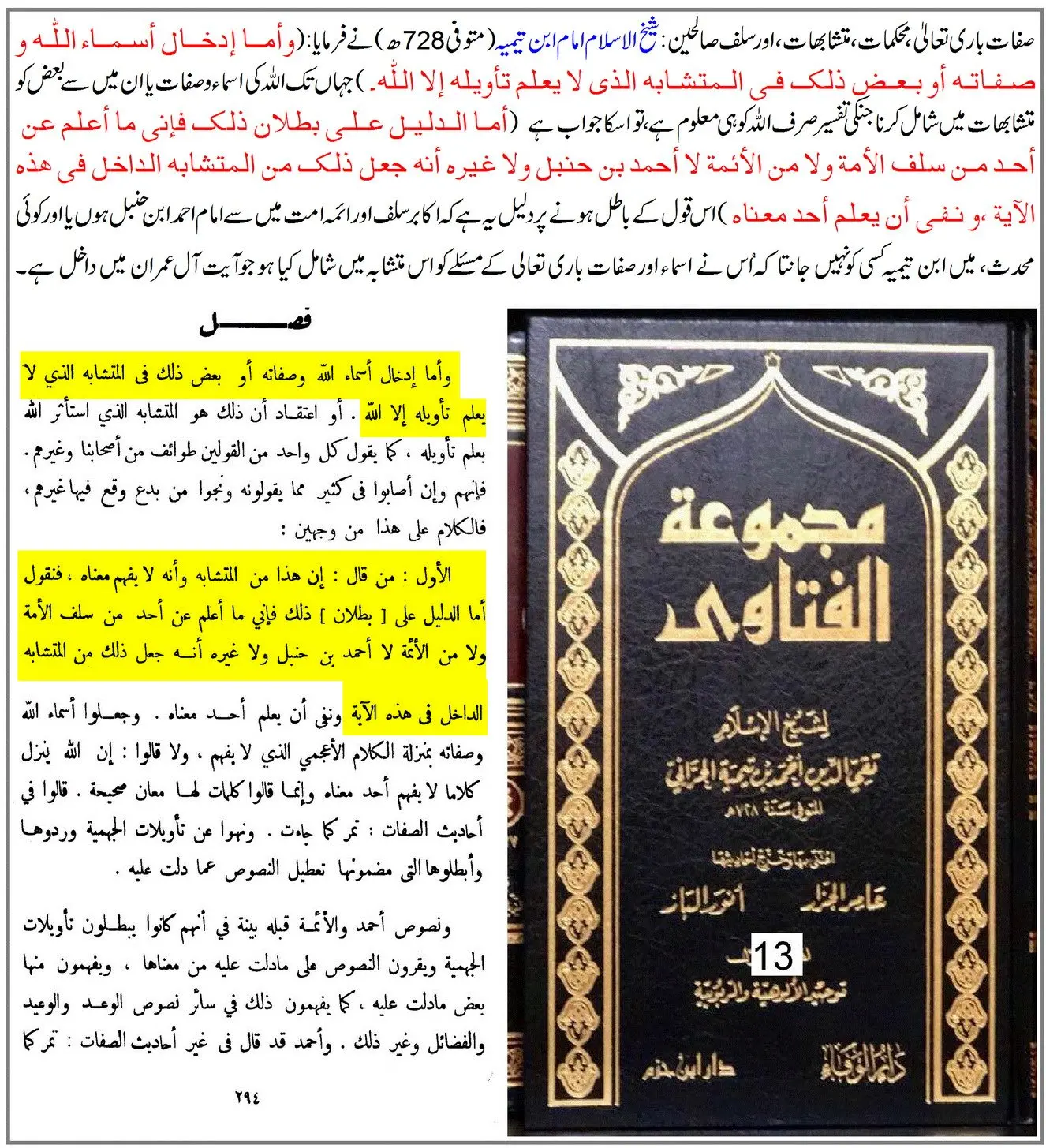 "أما إدخال أسماء الله وصفاته… في المتشابه… فما أعلم أحدا من السلف جعله من المتشابه"