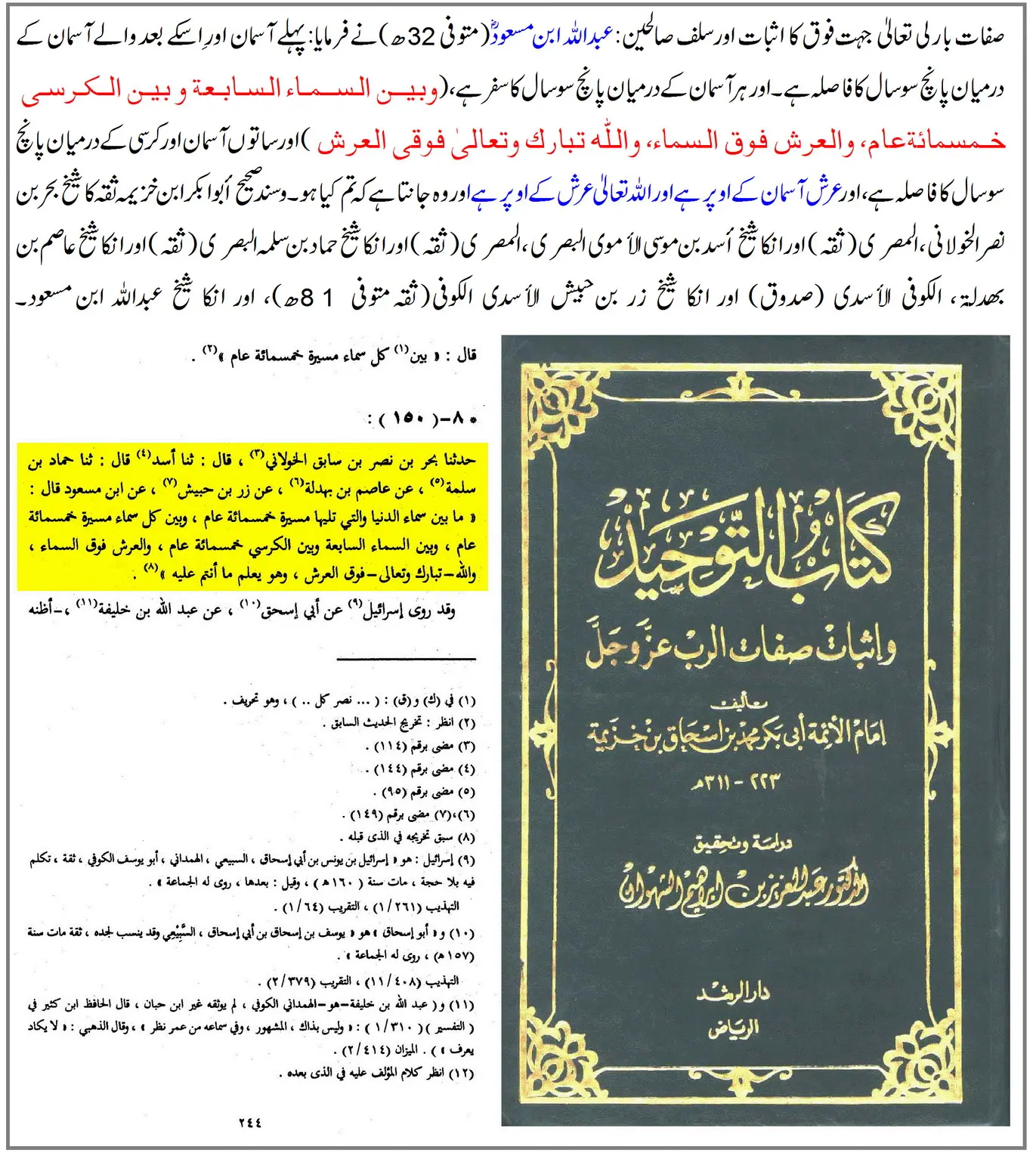 حَدَّثَنَا بَحْرُ بْنُ نَصْرٍ الْخَوْلَانِيُّ، قَالَ: ثنا أَسَدٌ، قَالَ: ثنا حَمَّادُ بْنُ سَلَمَةَ، عَنْ عَاصِمِ بْنِ بَهْدَلَةَ، عَنْ زِرِّ بْنِ حُبَيْشٍ، عَنِ ابْنِ مَسْعُودٍ، قَالَ:«مَا بَيْنَ سَمَاءِ الدُّنْيَا وَالَّتِي تَلِيهَا مَسِيرَةُ خَمْسِمِائَةِ عَامٍ… وَالْعَرْشُ فَوْقَ السَّمَاءِ، وَاللَّهُ تَبَارَكَ وَتَعَالَى فَوْقَ الْعَرْشِ، وَهُوَ يَعْلَمُ مَا أَنْتُمْ عَلَيْهِ».