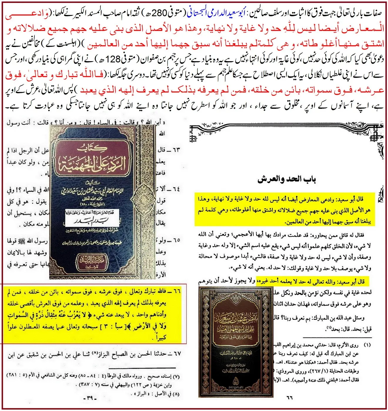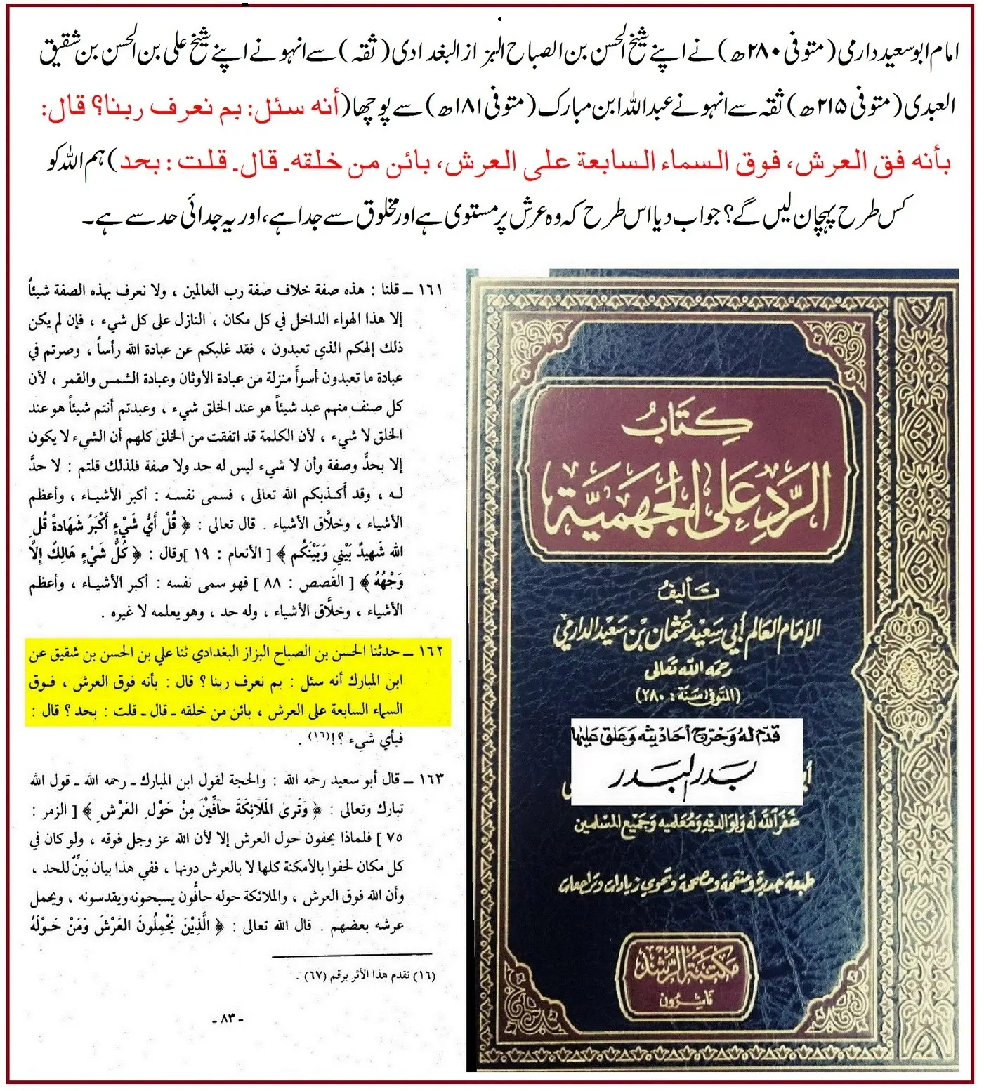 قَالَ أَبُو سَعِيدٍ: وَادَّعَى الْمُعَارِضُ أَيْضًا أَنَّهُ لَيْسَ لِلَّهِ حَدٌّ وَلَا غَايَةٌ وَلَا نِهَايَةٌ. وَهَذَا هُوَ الْأَصْلُ الَّذِي بَنَى عَلَيْهِ جَهْمٌ ضَلَالَاتِهِ. …ثُمَّ قَالَ: فَاللَّهُ تَبَارَكَ وَتَعَالَى فَوْقَ عَرْشِهِ، فَوْقَ سَمَاوَاتِهِ، بَائِنٌ مِنْ خَلْقِهِ، فَمَنْ لَمْ يَعْرِفْهُ بِذَلِكَ لَمْ يَعْرِفْ إِلَهَهُ الَّذِي يَعْبُدُ.