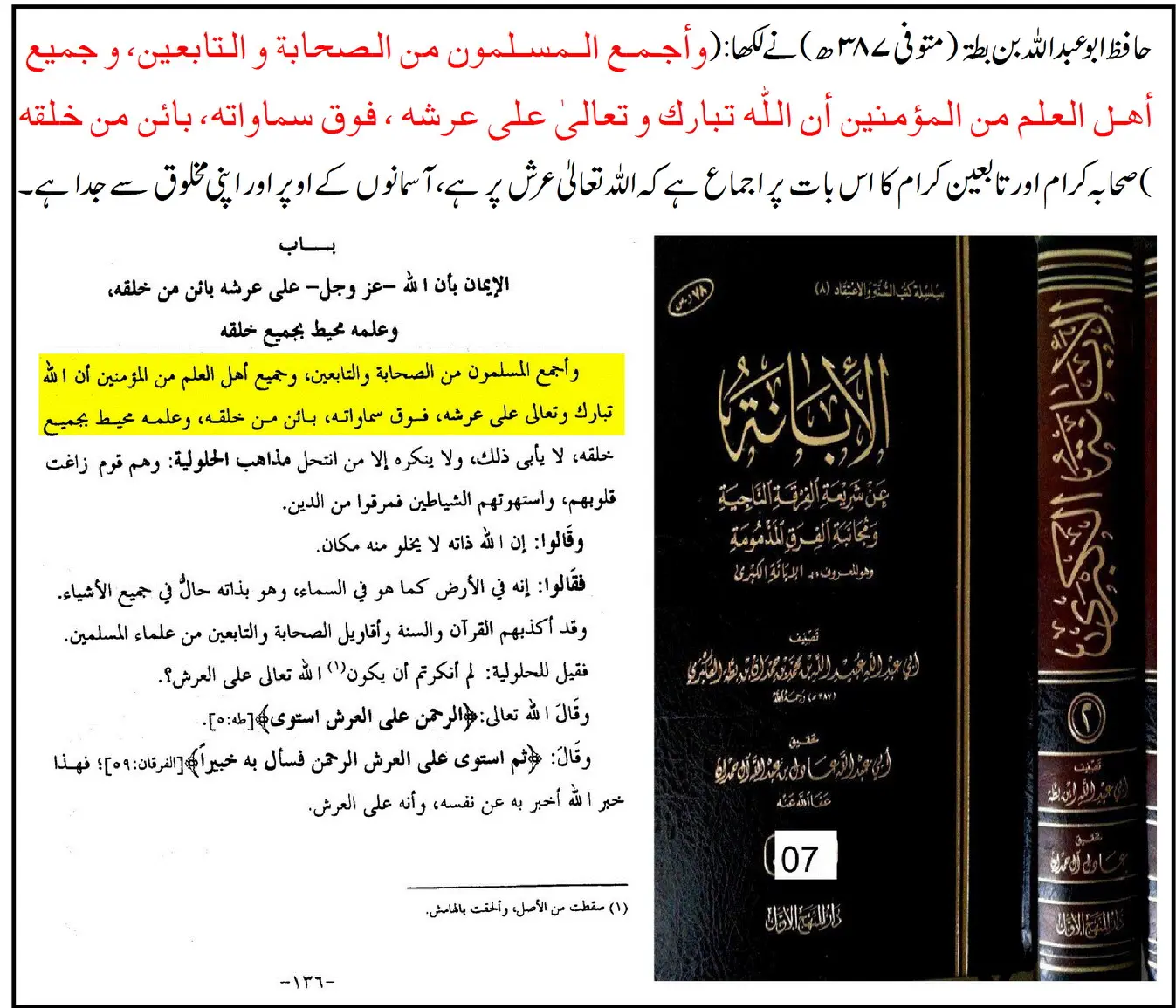 وَأَجْمَعَ الْمُسْلِمُونَ مِنَ الصَّحَابَةِ وَالتَّابِعِينَ وَجَمِيعِ أَهْلِ الْعِلْمِ أَنَّ اللَّهَ تَبَارَكَ وَتَعَالَى عَلَى عَرْشِهِ، فَوْقَ سَمَاوَاتِهِ، بَائِنٌ مِنْ خَلْقِهِ، وَعِلْمُهُ مُحِيطٌ بِجَمِيعِ خَلْقِهِ.Translation: