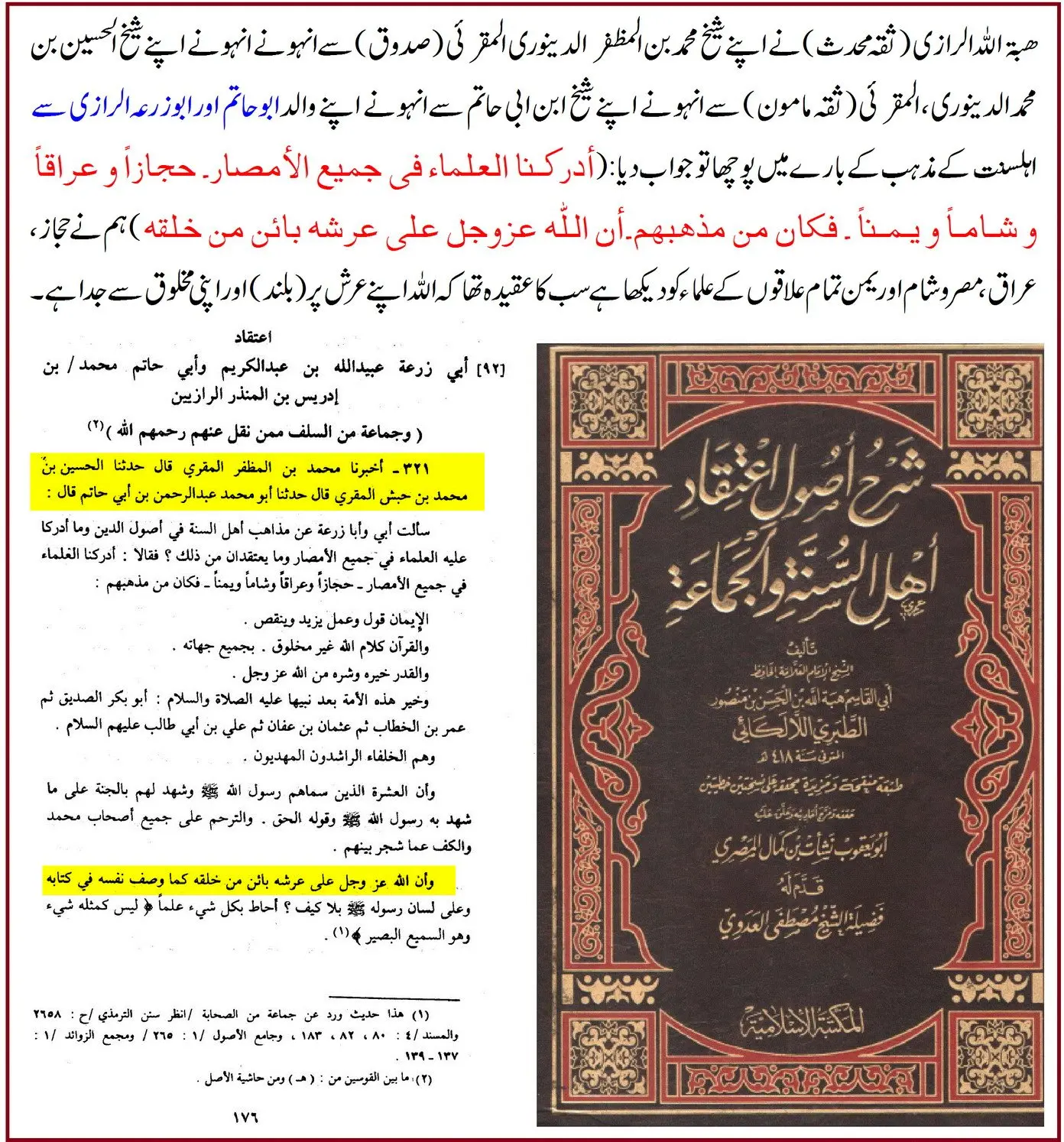 قَالَ عَبْدُ الرَّحْمَنِ بْنُ أَبِي حَاتِمٍ: سَأَلْتُ أَبِي وَأَبَا زُرْعَةَ عَنْ مَذَاهِبِ أَهْلِ السُّنَّةِ فِي أُصُولِ الدِّينِ … فَقَالَا:«أَدْرَكْنَا الْعُلَمَاءَ فِي جَمِيعِ الْأَمْصَارِ … فَكَانَ مِنْ مَذْهَبِهِمْ أَنَّ اللَّهَ عَزَّ وَجَلَّ عَلَى عَرْشِهِ، بَائِنٌ مِنْ خَلْقِهِ، كَمَا وَصَفَ نَفْسَهُ فِي كِتَابِهِ».