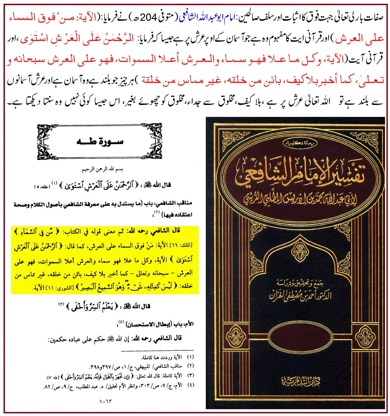قَالَ الشَّافِعِيُّ رَحِمَهُ اللَّهُ:ثُمَّ مَعْنَى قَوْلِهِ فِي الْكِتَابِ: (مَنْ فِي السَّمَاءِ) مَنْ فَوْقَ السَّمَاءِ عَلَى الْعَرْشِ، كَمَا قَالَ: (الرَّحْمَنُ عَلَى الْعَرْشِ اسْتَوَى). وَكُلُّ مَا عَلَا فَهُوَ سَمَاءٌ، وَالْعَرْشُ أَعْلَى السَّمَاوَاتِ، فَهُوَ عَلَى الْعَرْشِ، سُبْحَانَهُ وَتَعَالَى، كَمَا أَخْبَرَ بِلَا كَيْفٍ، بَائِنٌ مِنْ خَلْقِهِ، غَيْرُ مُمَاسٍّ لِخَلْقِهِ: (لَيْسَ كَمِثْلِهِ شَيْءٌ).