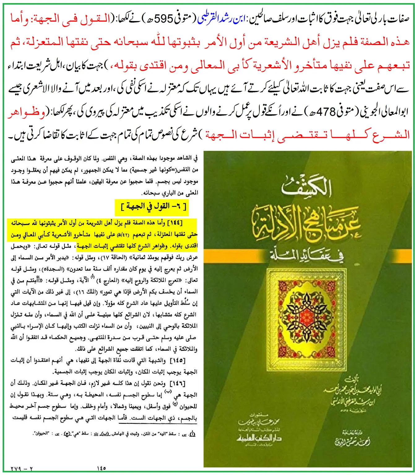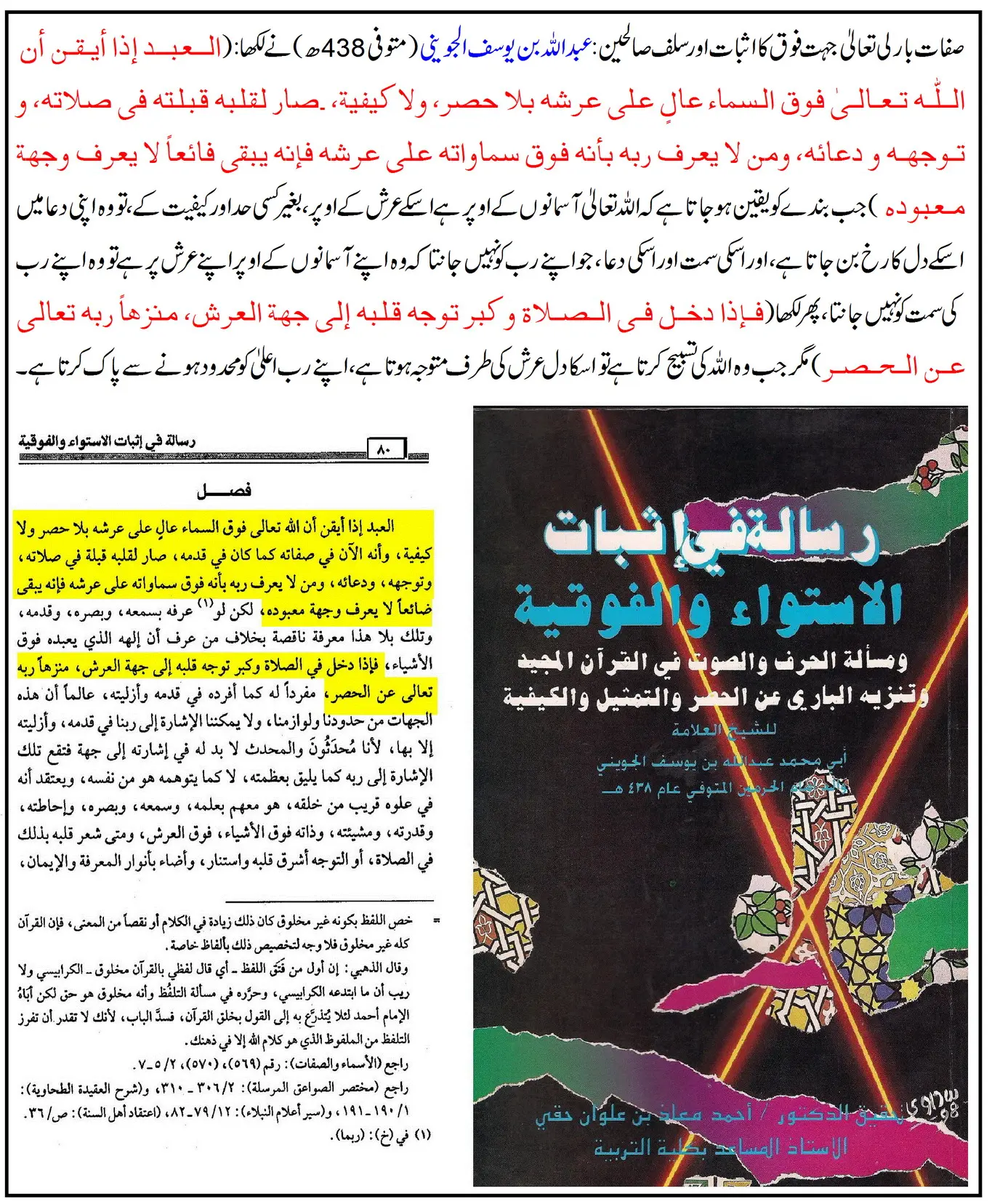 أما هَذِه الصّفة (الجهة) فَلَمْ يَزَل أهل الشريعة من أول الْأَمر بثبوتها لله سُبْحَانَهُ حَتَّى نفتها المعتزلة، ثم تبعهم على نَفْيها متأخرو الأشاعرة كأبي المعالي الجويني. وظواهر الشرع كلها تقتضي إثبات الجهة.Translation: