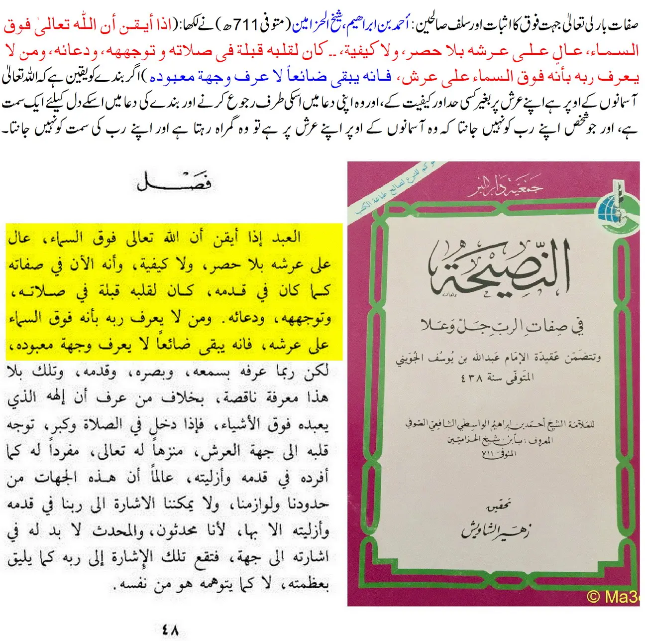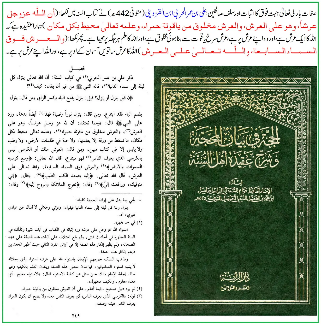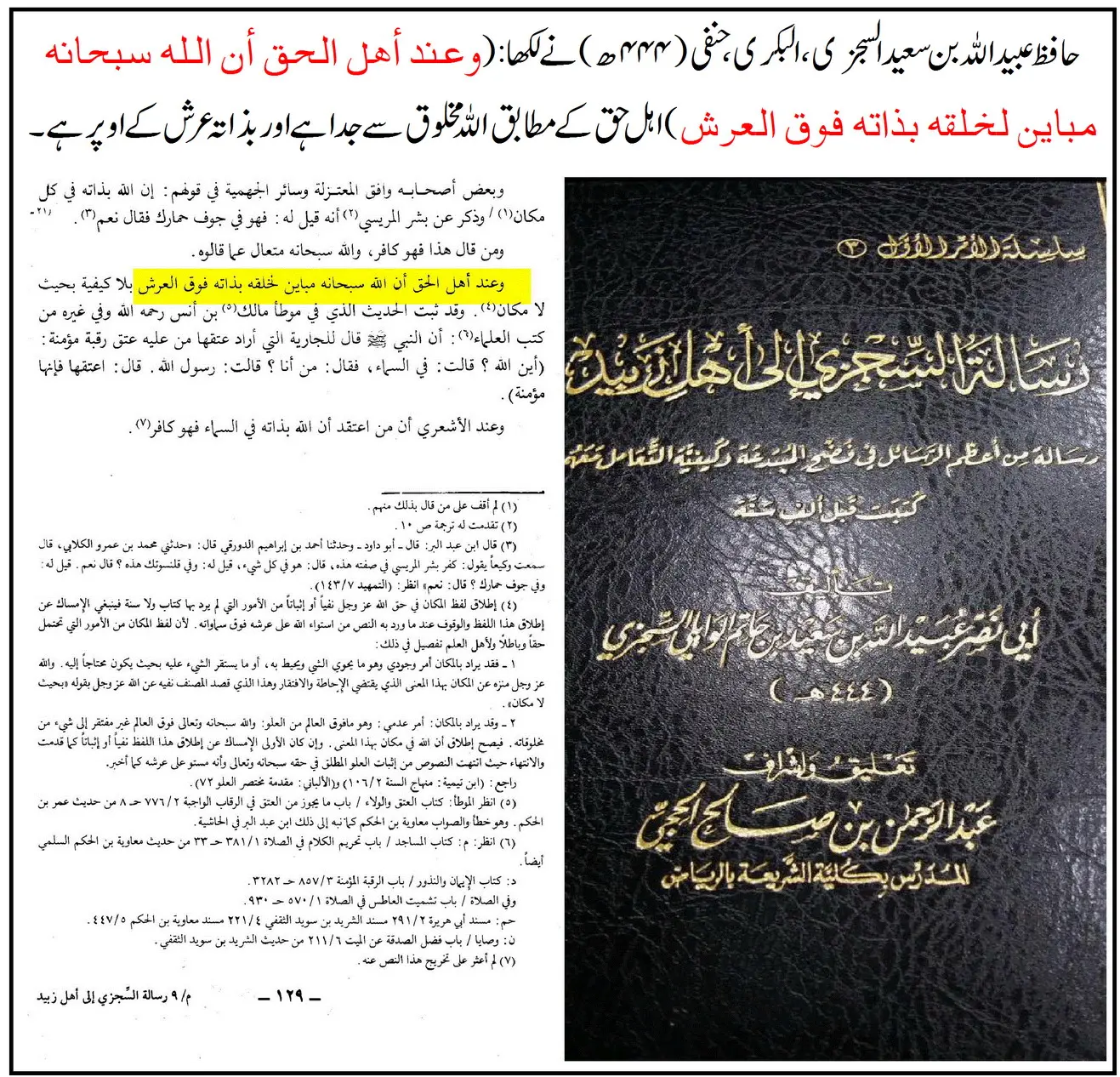 العَبْدُ إِذَا أَيْقَنَ أَنَّ اللَّهَ تَعَالَى فَوْقَ السَّمَاءِ، عَالٍ عَلَى عَرْشِهِ بِلاَ حَصْرٍ وَلاَ كَيْفِيَّةٍ … وَمَنْ لاَ يَعْرِفْ رَبَّهُ بِأَنَّهُ فَوْقَ سَمَاوَاتِهِ عَلَى عَرْشِهِ فَإِنَّهُ يَبْقَى ضَائِعاً لاَ يَعْرِفُ وَجْهَةَ مَعْبُودِهِ».Translation: