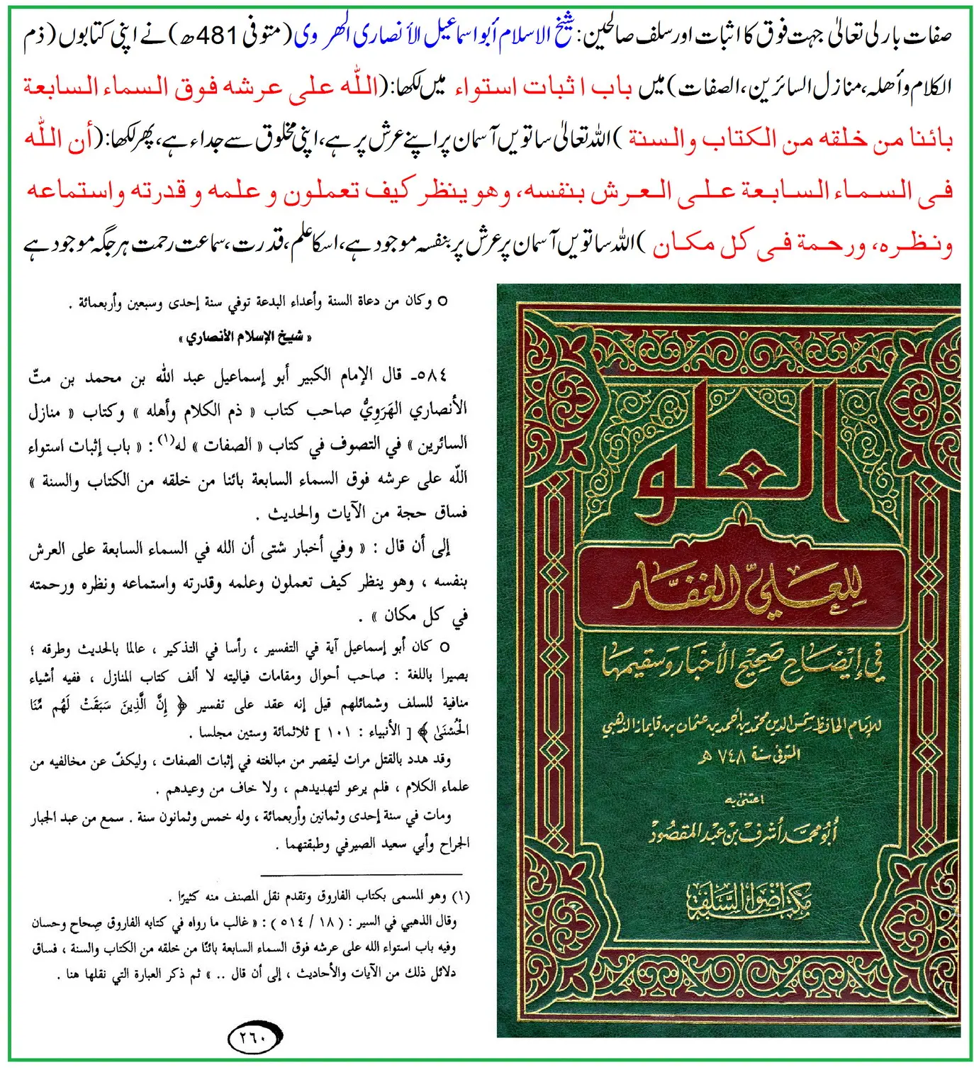 قال الإمام الكبير أبو إسماعيل الهروي في كتاب الصفات:«باب استواء الله على عرشه فوق السماء السابعة بائنا من خلقه من الكتاب والسنة. … وفي أخبار شتى أن الله في السماء السابعة على العرش بنفسه، وهو ينظر كيف يعملون، وعلمه وقدرته واستماعه ونظره ورحمته في كل مكان».