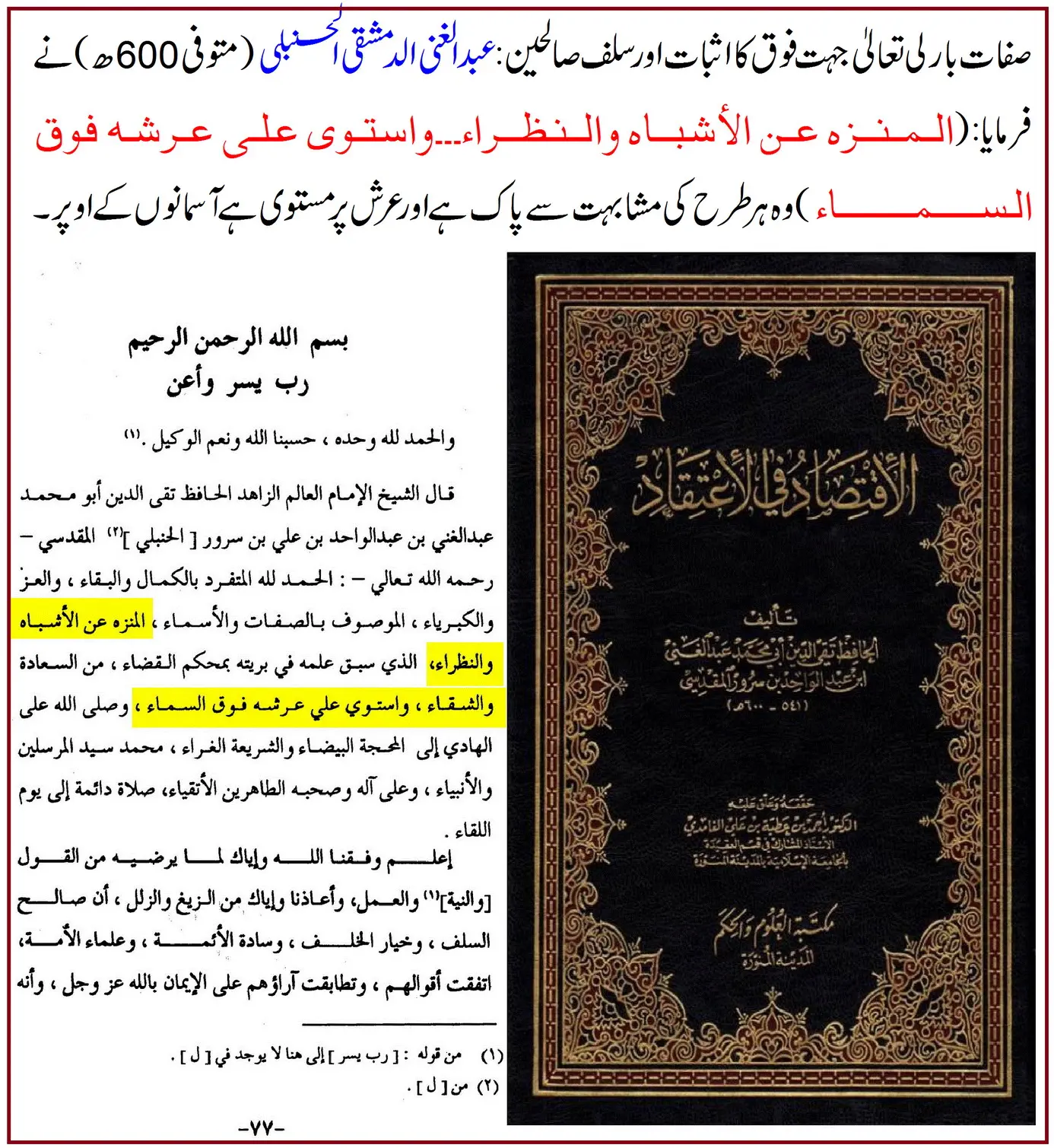 Imām ʿAbd al-Ghanī al-Maqdisī رحمه الله said: “(Allah is) free from likenesses and equals… and He rose over His Throne above the heaven.”Reference: