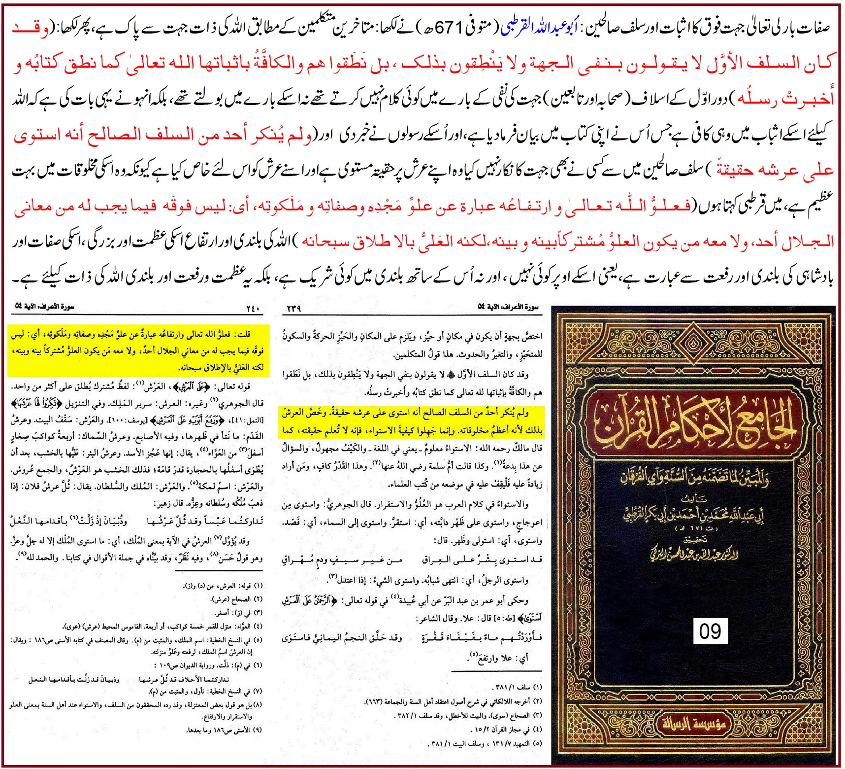 Imām al-Qurṭubī said: “The early Salaf—may Allah be pleased with them—did not speak of denying direction, nor did they utter such a thing. Rather, they and the people at large affirmed it for Allah Almighty, as His Book spoke and His Messengers informed. And none of the Salaf denied that He truly rose over His Throne.”Reference: