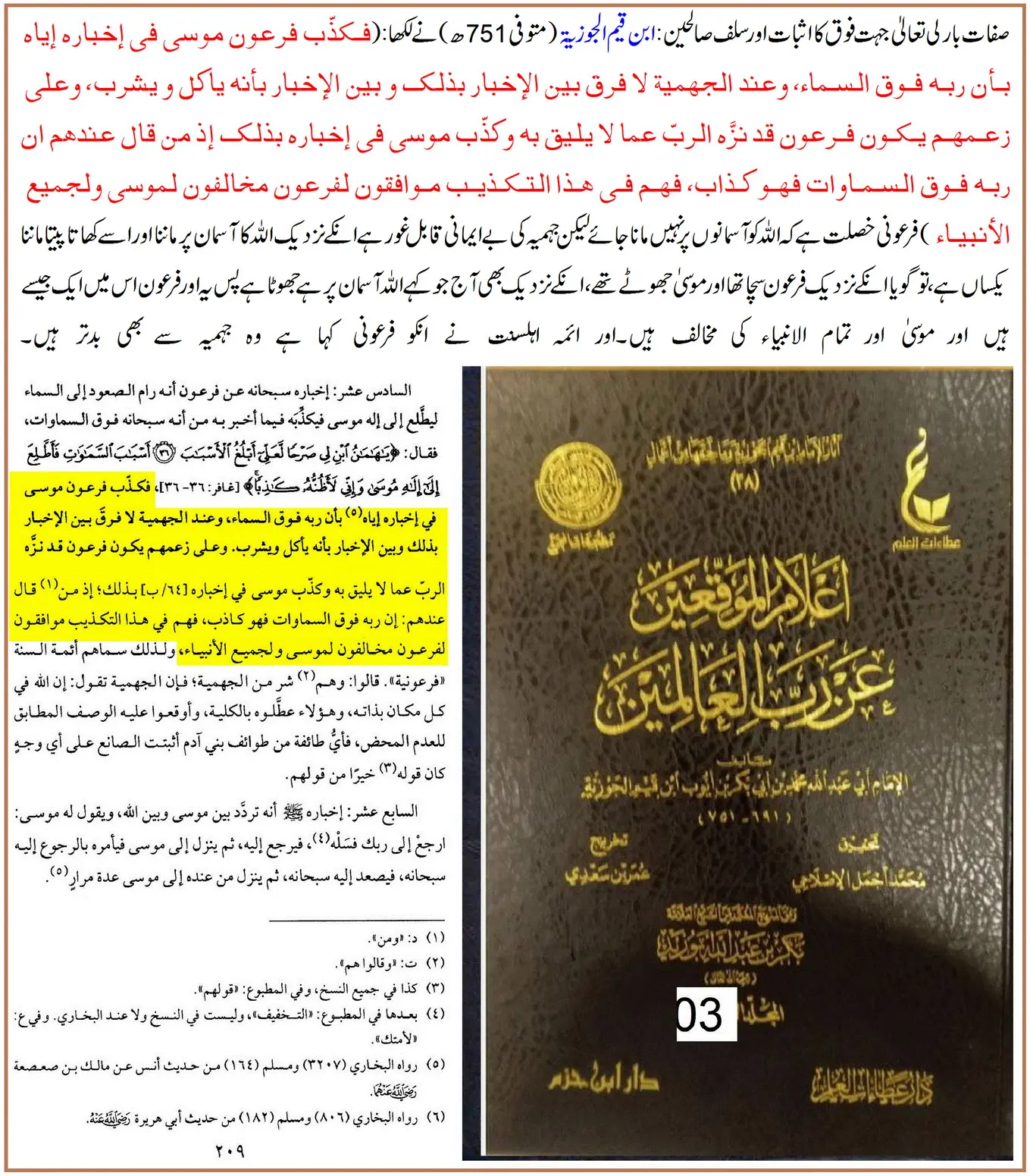 Ibn al-Qayyim رحمه الله said: “According to their claim, Firʿawn would have declared the Lord free from what is unbefitting and would have declared Mūsā a liar in his informing (that his Lord is above the heavens)—for whoever says: ‘My Lord is above the heavens’ would be lying! Thus, in this denial they agree with Firʿawn and oppose Mūsā and all the Prophets.”Reference: